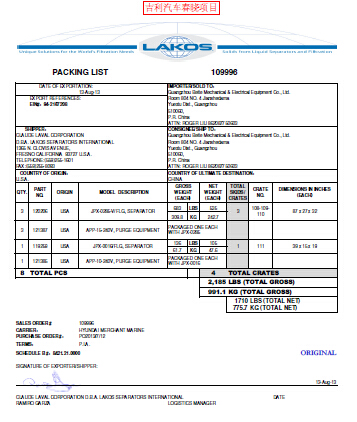 2013年7月15日,成功签约向吉利汽车集团宁波春晓项目供应美国原装进口LAKOS固液分离器,型号为JPX-0285-V/FLG/APP,数量4台(套)配置自动气动夹阀排渣系统。预计交货时间为10月5日。