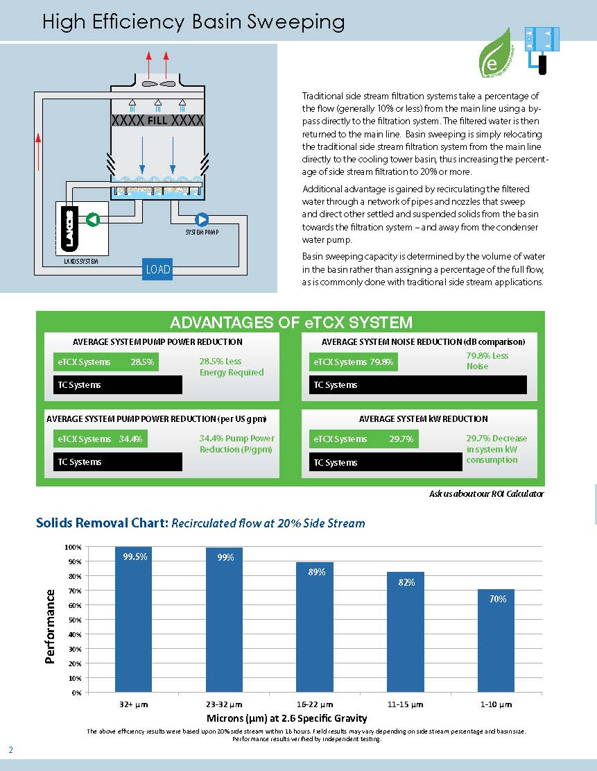 LAKOS高效率eTCX冷却塔清洁系统,帮助保持冷却塔底盆没有会导致结垢、腐蚀、堵塞、藻类繁殖的悬浮固体,控制这些因素会是冷却塔系统设备有较低的维护、提升化学药剂的效率、更长的冷却塔和下游设备的使用寿命,并且最重要的是降低了长期的水和电源的运行成本。